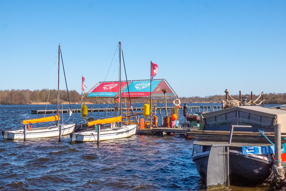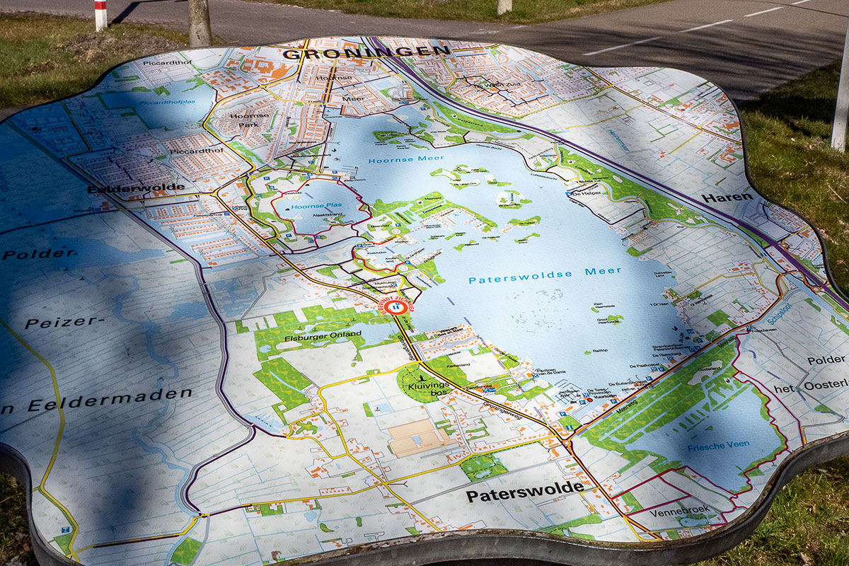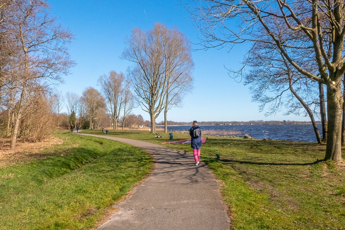 De lucht is opnieuw strakblauw, de zon wordt al lekker warm en er waait een frisse wind. We lopen de hele route over het asfalt, het water is altijd aan onze rechterkant. Het is een mooie wandeling, waarbij je kennismaakt met de bijzondere omgeving dicht bij de stad Groningen. De beide meren spelen de hoofdrol.