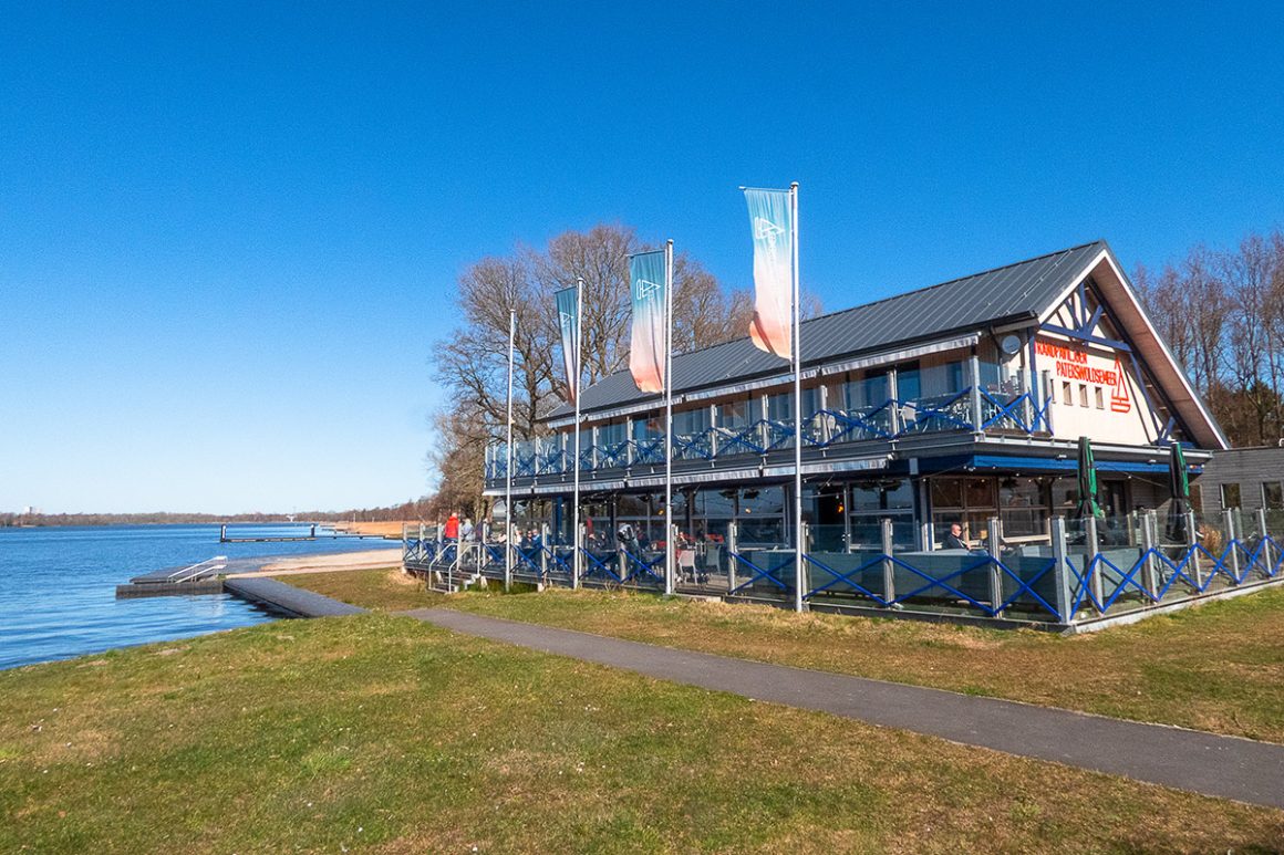 Wij besluiten door te lopen en komen langs vele horeca die deze weg rijk is. De eerste in de rij is het Strandpaviljoen Paterswoldsemeer. Tijd voor lunch. Het zit heerlijk achter het glas en we kijken uit over het meer. Er is hier ook een strandje aangelegd, een parkeerplaats voor campers en een grasveldje.