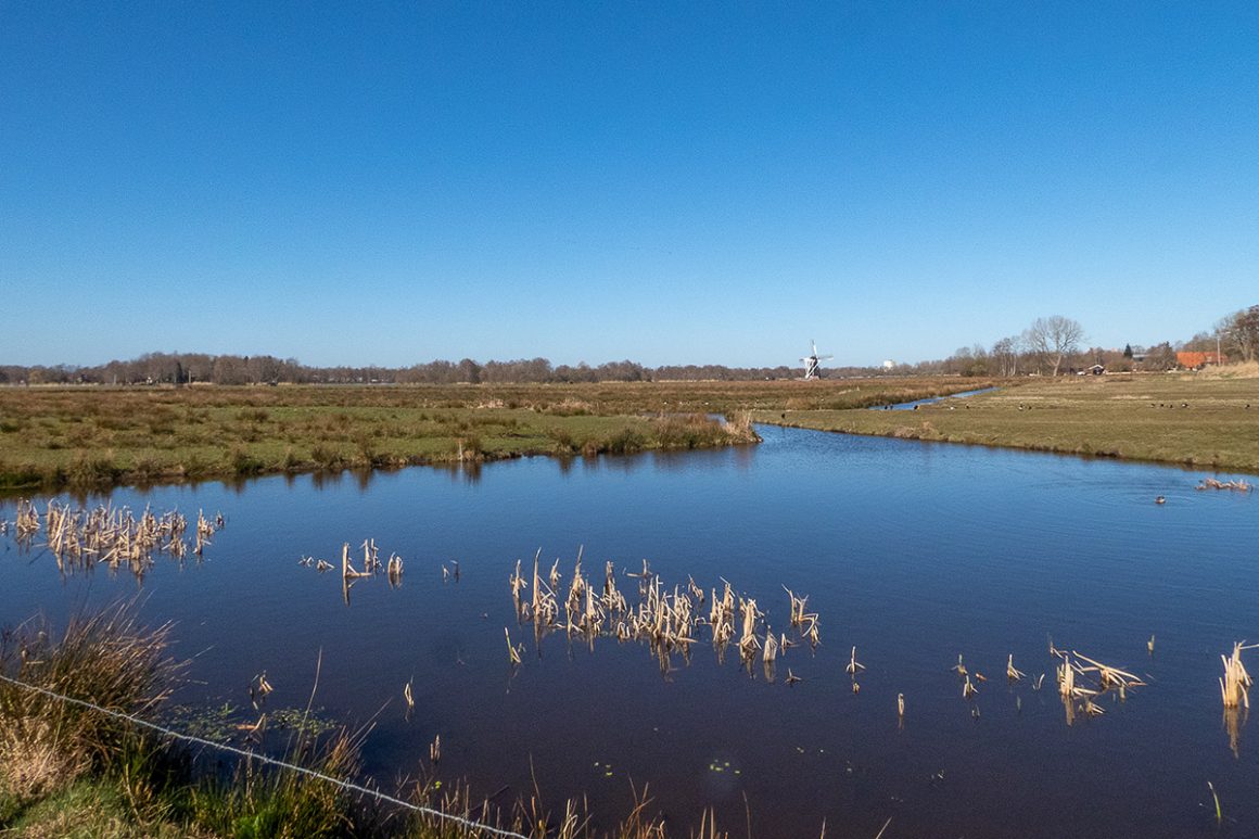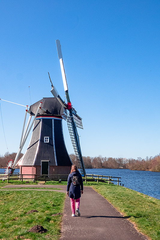 De route loopt een tijdje langs het water en aan het einde, bij een klein parkeerplaatsje, gaan we linksaf weg van het meer. Hier komen we uit op het ‘doorgaande B-weggetje’ en slaan we rechtsaf richting het sluisje, over het bruggetje. Na een kleine bocht gaan we meteen rechtsaf, weer richting het Paterswoldsemeer. We lopen langs een paar huizen en in de verte staat de bekende molen.