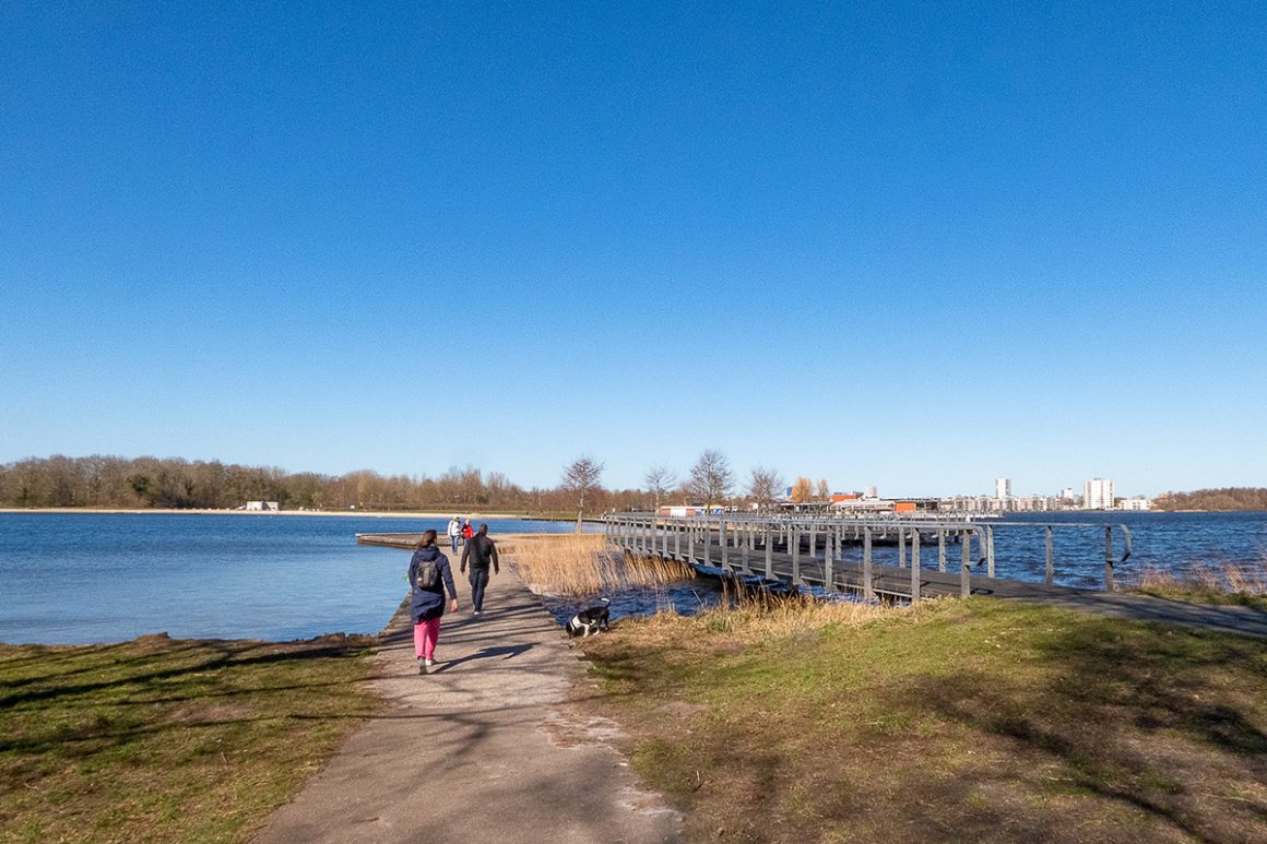 Wij staan met onze rug naar het restaurant en gaan rechts, richting de houten brug die we over gaan. We komen uit in een parkje waar honden los mogen lopen. Aan de oever van het meer zijn er houten vlonders gebouwd waar je heerlijk kunt vertoeven; een picknick of lekker zonnen als het straks weer lekker warm is.