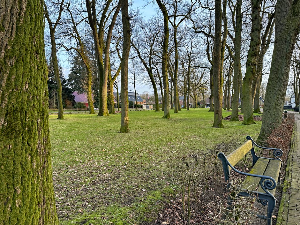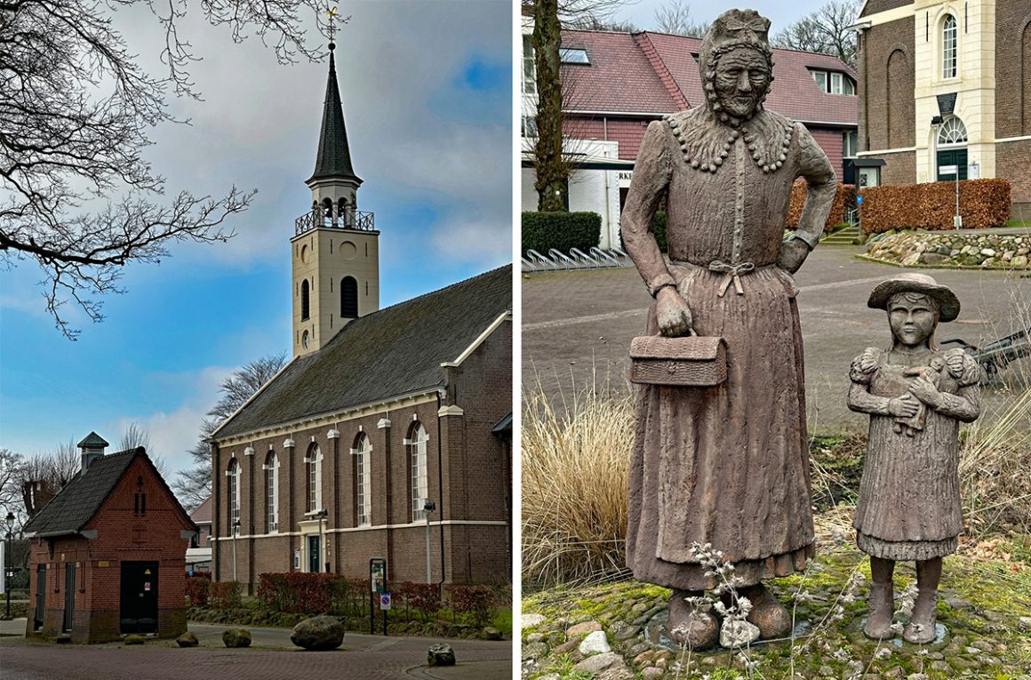 Het Kerkplein, bij de kerk met de slanke witte kerktoren, is ons startpunt. Op het plein een oud transformatorhuisje en het beeld ‘Otie en kleinkind’, verwijzend naar de belangrijke rol van oma of opoe in de opvoeding van kleinkinderen. Vader en moeder hadden het te druk op het land.