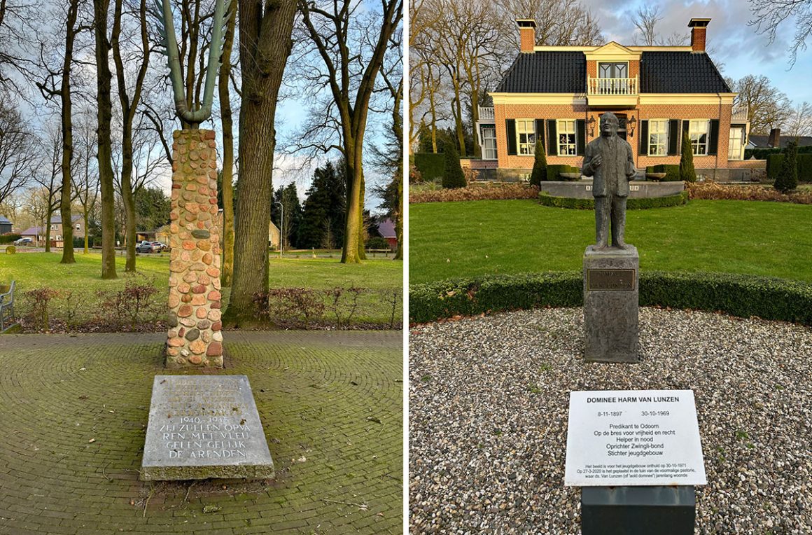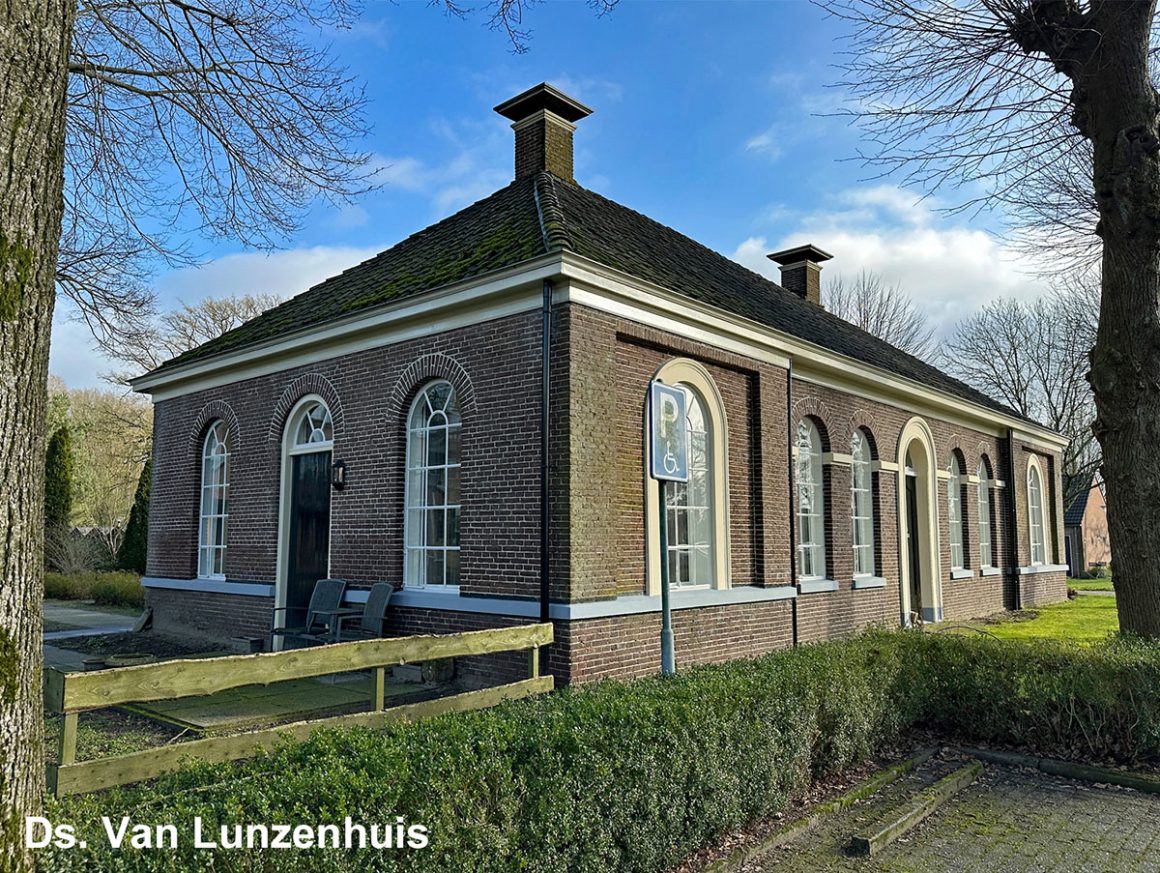 We lopen door en passeren het Ds. Van Lunzenhuis (Rijksmonument), onderdeel van Zorgcentrum De Paasbergen. Vroeger een armhoes of warkhoes, nu een rusthuis met appartementen voor bejaarden. De predikanten Lieftinck (rond 1860) en Van Lunzen (jaren 60 vorige eeuw) hadden beiden veel oog voor alleenstaanden en ouderen. Een beeld van Van Lunzen staat bij de pastorie, waar we aan het einde langslopen.