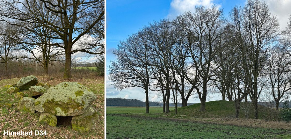 Over geschiedenis gesproken. We passeren een hunebed, logisch in deze omgeving. Het ligt er al sinds medio 19e eeuw. Het nummer D34 zegt genoeg over het aantal. Ook de vele grafheuvels in deze streek zijn uit ver vervlogen tijden: de Steen- of Bronstijd. We passeren er een aantal.