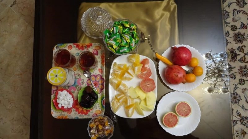 Dan bereiken we Nasrin’s appartement; een prachtig warm huis om stil van te worden. Nooit eerder zag ik een Iraans huis, laat staan Perzisch interieur. Twee werkelijk prachtig gedetailleerde tapijten bedekken de vloer en verschillende stukken ‘tapijtkunst’ hangen aan de muren. Omlijst in prachtige, robuuste lijsten. Er zijn decoratieve, klassiek uitziende meubels aan beide kanten van de kamer. En aan het plafond hangen twee fantastisch extravagante kroonluchters. Wat een weelde! De open keuken verbind de woonkamer met de keuken en geeft het appartement een ruim gevoel. Welkom geheten door deze familie, in deze woning, voel ik me een ontzettende bofkont.