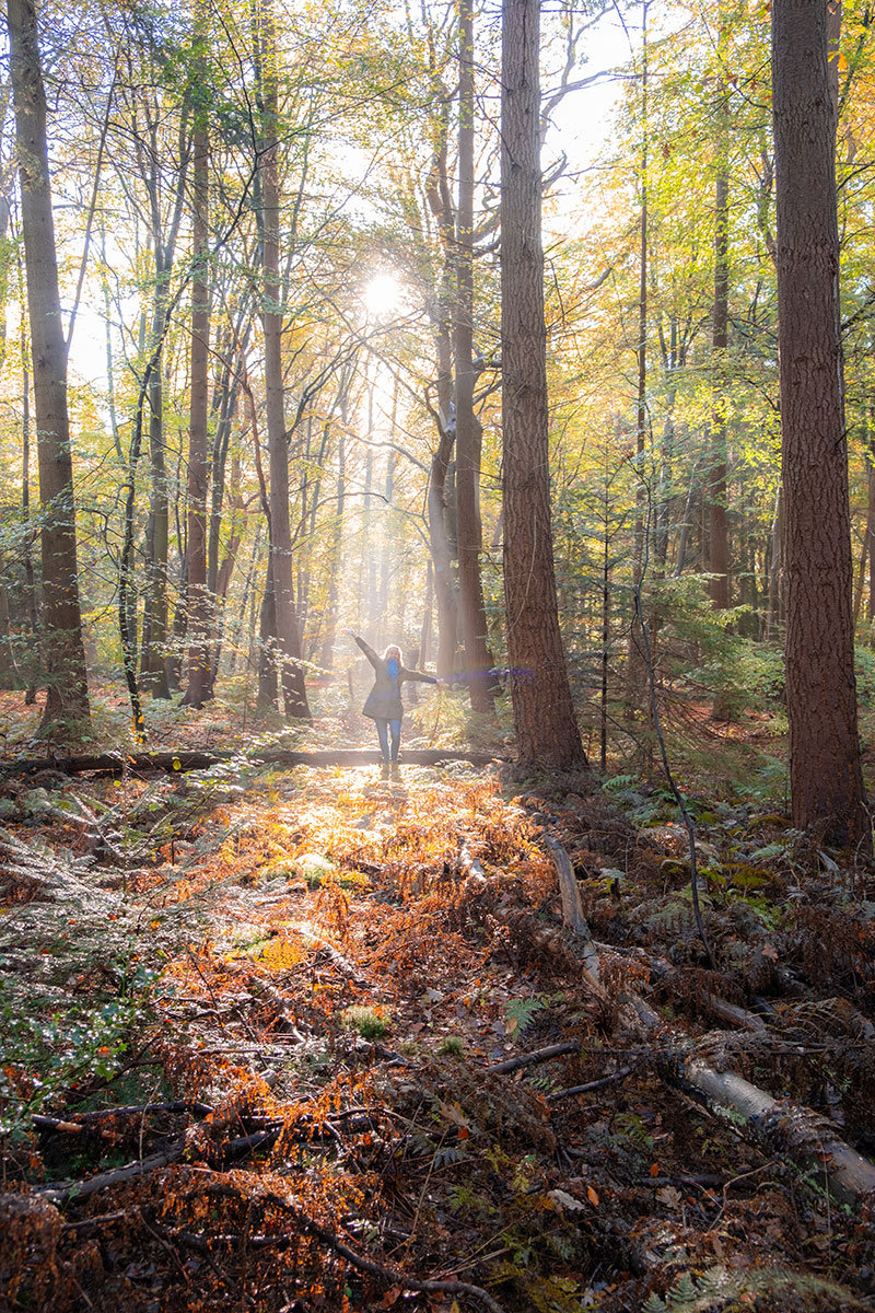 Deze wandeling hebben we al meerdere keren gelopen, maar het verveelt nooit. Elk seizoen is weer anders. Vandaag is het volop herfst en dat is te merken. Doordat de zon laag staat, krijgt het bos een mooie warme gloed. Er straalt overal licht doorheen en we zien letterlijk de zonnestralen door de bomen schijnen. Er ontstaan lichtplekken op de grond en mijn zus zet mij op de foto precies in het midden van zo’n lichtspot.