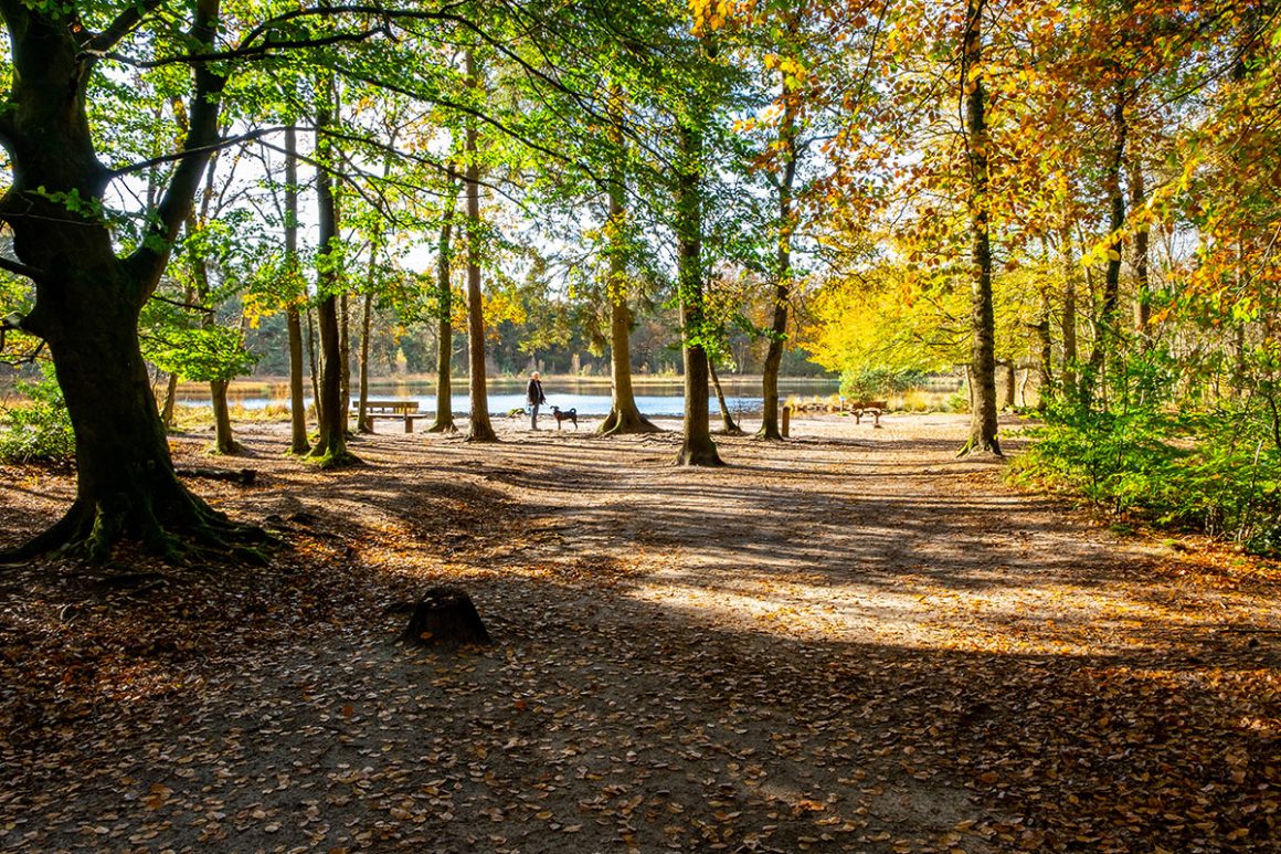 We pauzeren op het houten bankje en genieten van de rust en het licht dat op het vennetje schijnt. Soms is het een drukte van jewelste in de positieve zin van het woord. Ook honden vinden het heerlijk om in het water te springen en te zwemmen.
