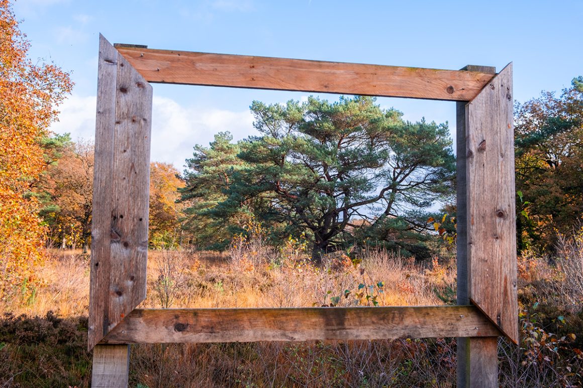 We wandelen over het zandpad richting het heidegebied. Onderweg zijn er houten lijsten neergezet. Als je er doorheen kijkt, ontstaat er een natuurlijk schilderij. Vanuit diverse hoeken en door de verschillende seizoenen ontstaat er steeds weer een ander beeld.