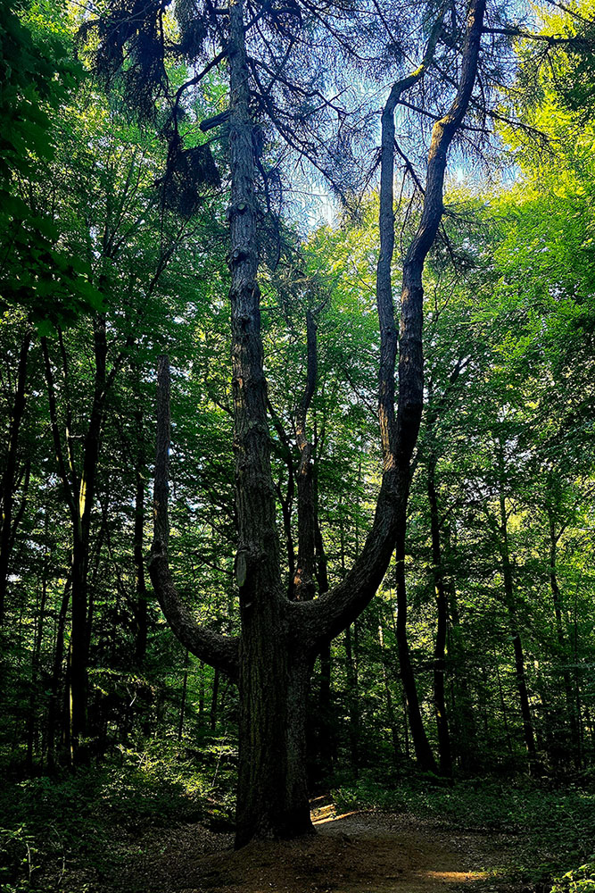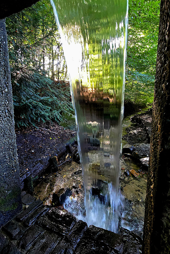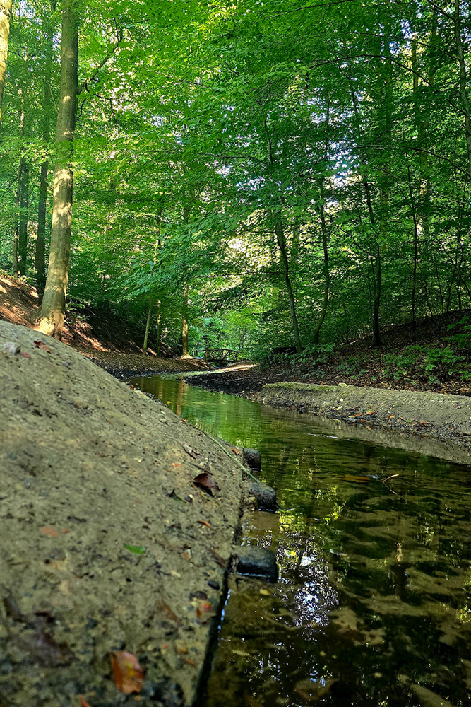 Het rode klompje op de paaltjes dirigeert ons de Hemelse Berg op. Een behoorlijke klim waarna we weer afdalen langs een diep ravijn. Een plek die bekendstaat als ‘De Hel’. Verderop wordt het echt idyllisch, een klaterende sprengenbeek trekt direct je aandacht. Je passeert meerdere houten bruggetjes langs watervalletjes. Een ervan is bijzonder, namelijk ‘Het Grothuisje’, gebouwd van mislukte bakstenen.