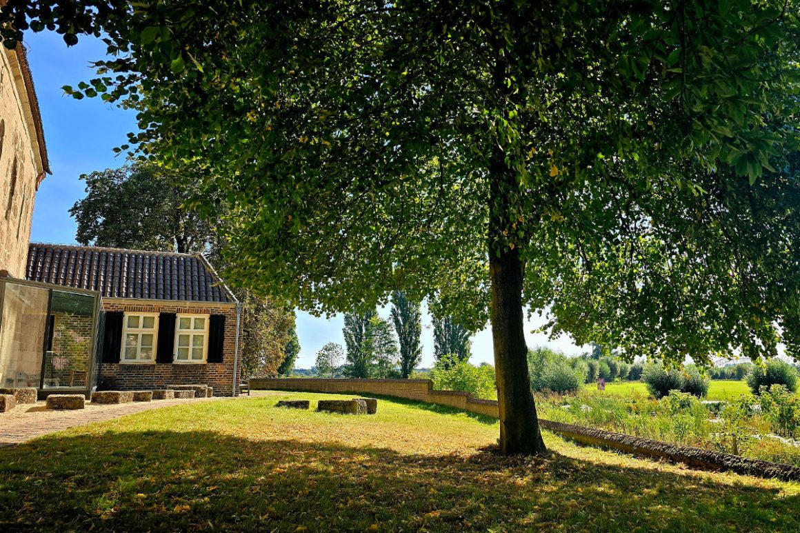 Het bos laten we achter ons en we wandelen verder over een kerkenpaadje. Hier krijg je al zicht op de Nederrijn en word je getrakteerd op weidse uitzichten over de uiterwaarden. Strakke lijnen door hobbelige velden met knotwilgen en roerloze reigers. Geen wonder dat schilders als Willem Maris, Hendrik Willem Mesdag en Jan Toorop hier geïnspireerd raakte om de Oosterbeekse school te vormen, een van de oudste schilderskolonies van Nederland. Voordat je het pad naar de kerk toe bewandelt, zie je nog een fantastisch huis. Henks Pluktuin genaamd, met mooie biologische producten te koop.