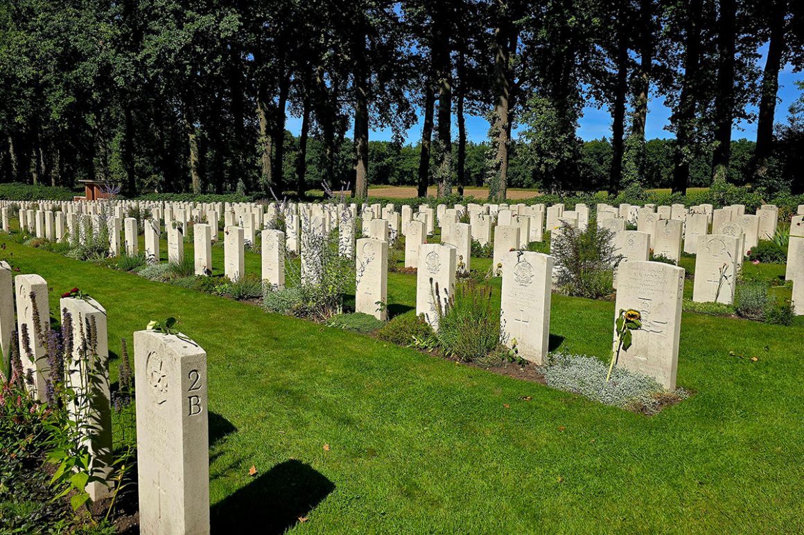 Langs de bosranden en open velden van Landgoed Boschveld kom je langs de indrukwekkende Airborne begraafplaats met de vele witte kruisen van vaak jonge jongens (18/19 jaar oud) die hebben gestreden bij de slag om Arnhem. We worden er stil van.