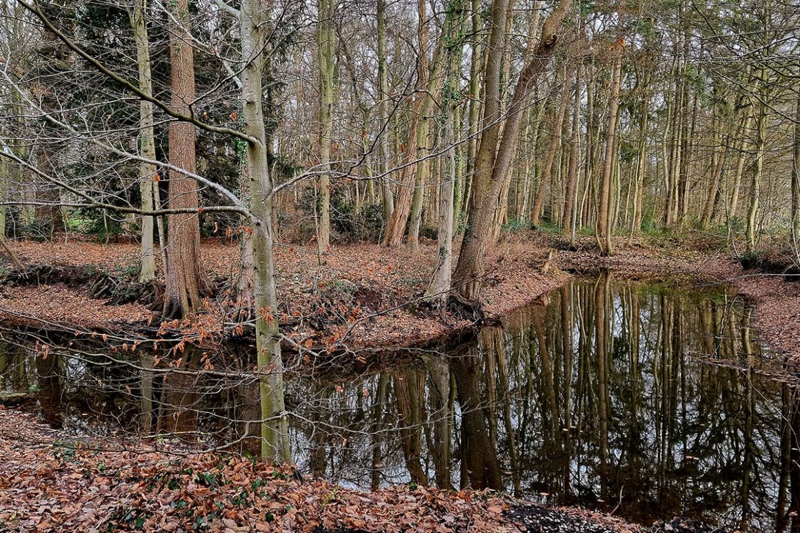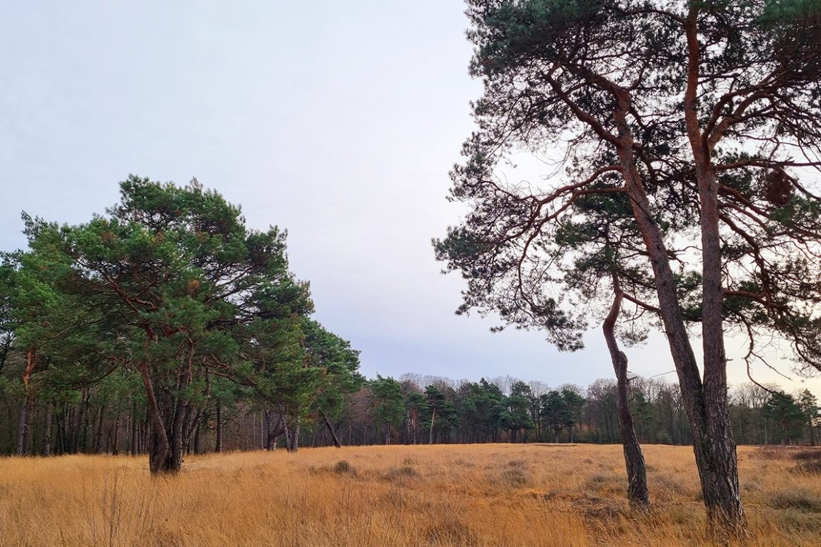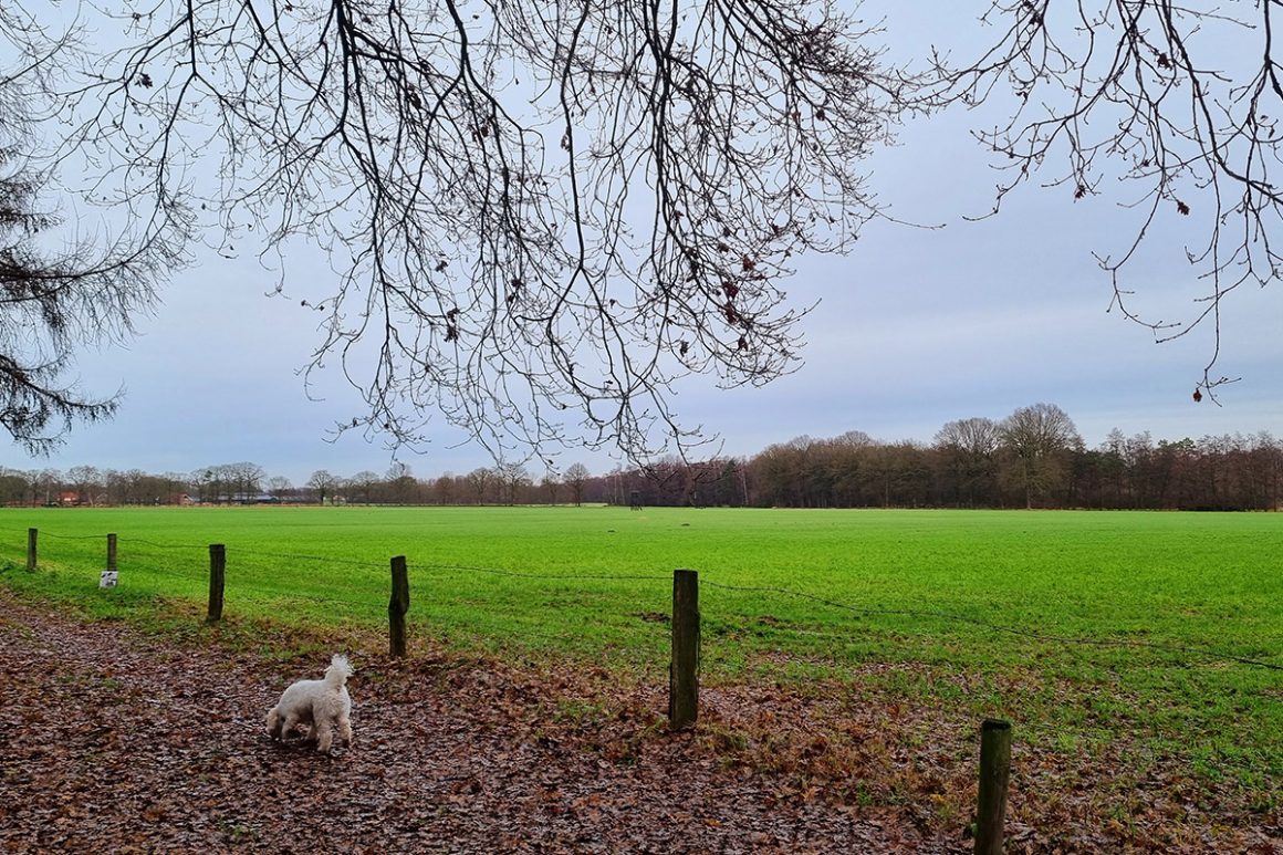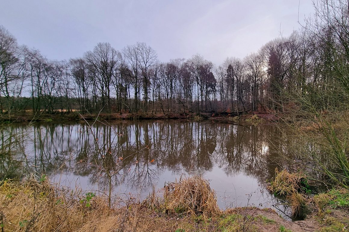 We lopen het licht in; langs een open stuk weiland en er komt zelfs een waterig zonnetje door. Hier passeren we een diepe vijver waar vroeger klei werd opgegraven. We vervolgen het pad en bij de open vlakte blijven we even stilstaan. Wauw! Met het zonnetje op het prachtige hoge gras, de zon en het uitzicht… het lijkt gewoon op een Afrikaanse savanne. We genieten er een tijdje van voordat we verder gaan richting ons eindpunt, de havezate.