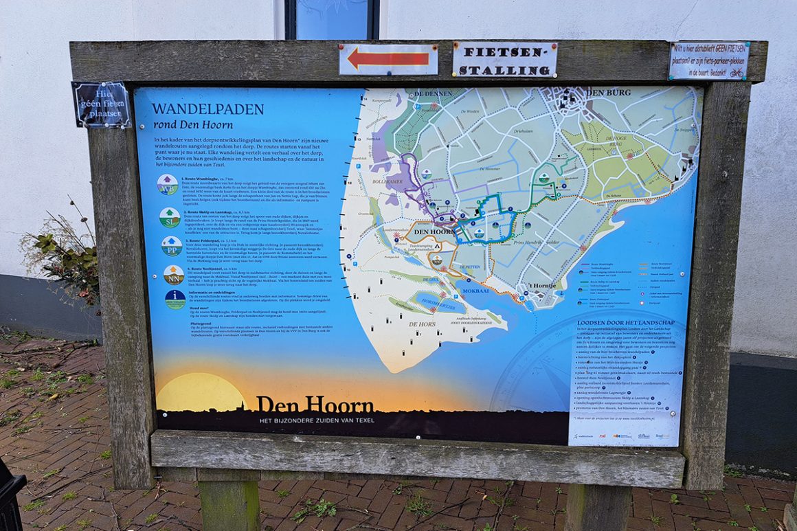 Deze rondwandeling van ruim 8 kilometer start op het dorpsplein in Den Hoorn. Je houdt rechts aan, wanneer je start met je rug naar het routebord. Je houdt de Stolpweg aan en loopt de bebouwde kom uit. Aan je linkerhand zie je stal ‘De oude hoorn’. Na deze stal ga je linksaf het fietspad op. Hier kom je direct wat te weten over de Texelse historie. Wist je dat in 1398 Oude Hoorn door de Friezen verwoest werd? Het huidige Den Hoorn is toen ontstaan!