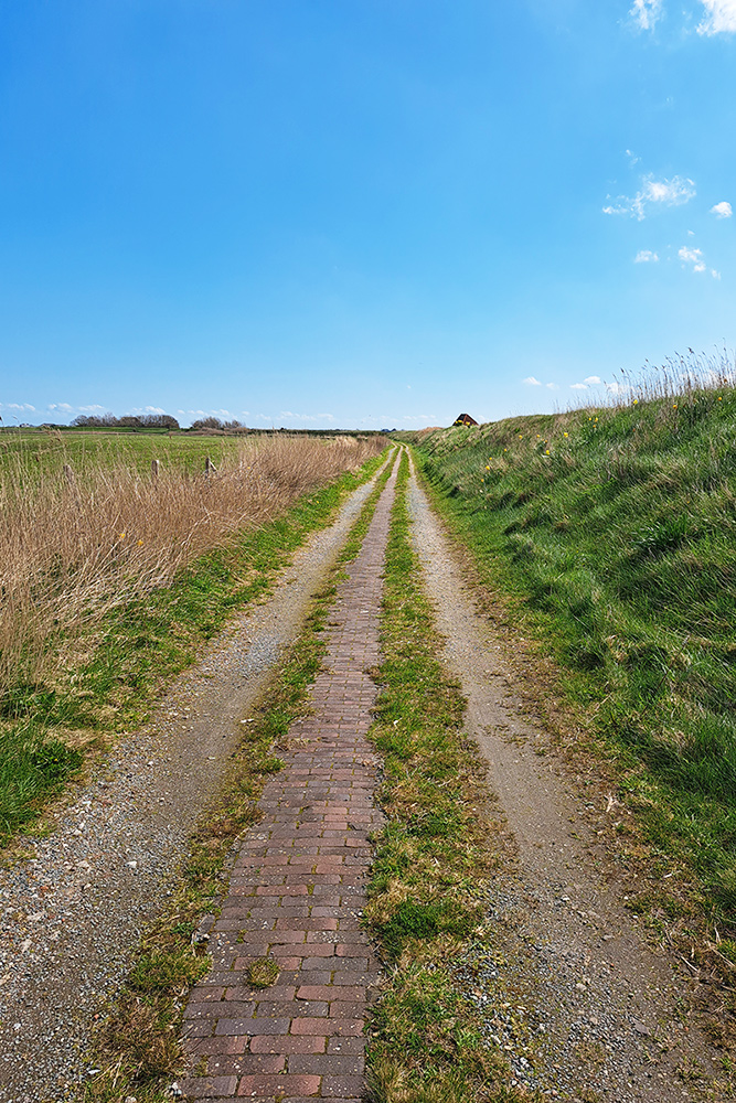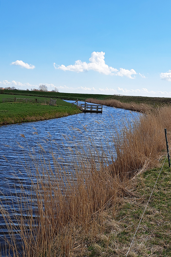 Je verlaat het grasveld door de Watermolenweg over te steken. Hier volg je het pad langs de dijk. Dit pad buigt af naar links en loopt omhoog. Afhankelijk van het broedseizoen bepaal je welke kant je opgaat (beide routes komen over enkele 100-en meters op hetzelfde punt uit). Wij liepen de route in het broedseizoen en moesten linksaf. Deze weg (De Grie) liepen we uit tot de Hoornderweg. Daar ga je naar rechts.