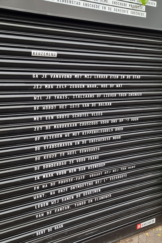 In dit straatje vind je overigens allerlei gedichten op de muren en deuren. Leuk om even bij stil te staan. Langs het gemeentehuis gaan we naar de Grote Markt met de Grote kerk en haar gezellige terrasjes. Heb je zin in een drankje? Neem plaats bij Novi of bij Bardot. Voor de echte culinaire liefhebbers tip ik nog graag even Joann. Onze wandeling eindigt weer bij Hogeschool Saxion met de treffende slogan op de trappen: