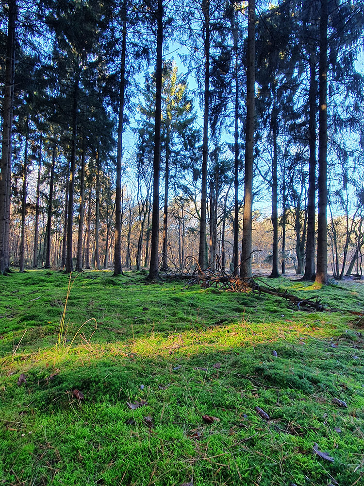 Je loopt door de hekjes over het rooster heen en staat gelijk tussen de sparrenbomen en hulststruiken. De hoogteverschillen vallen gelijk op. Deze hoogteverschillen in het terrein zijn aan het einde van de laatste IJstijd ontstaan onder invloed van grote zandstormen. Na ongeveer 350m volg je de paarse pijl en sla je linksaf. Je slingert het bos door. Aan weerszijden van het pad vind je in de vorm van bomkraters sporen uit WOII.