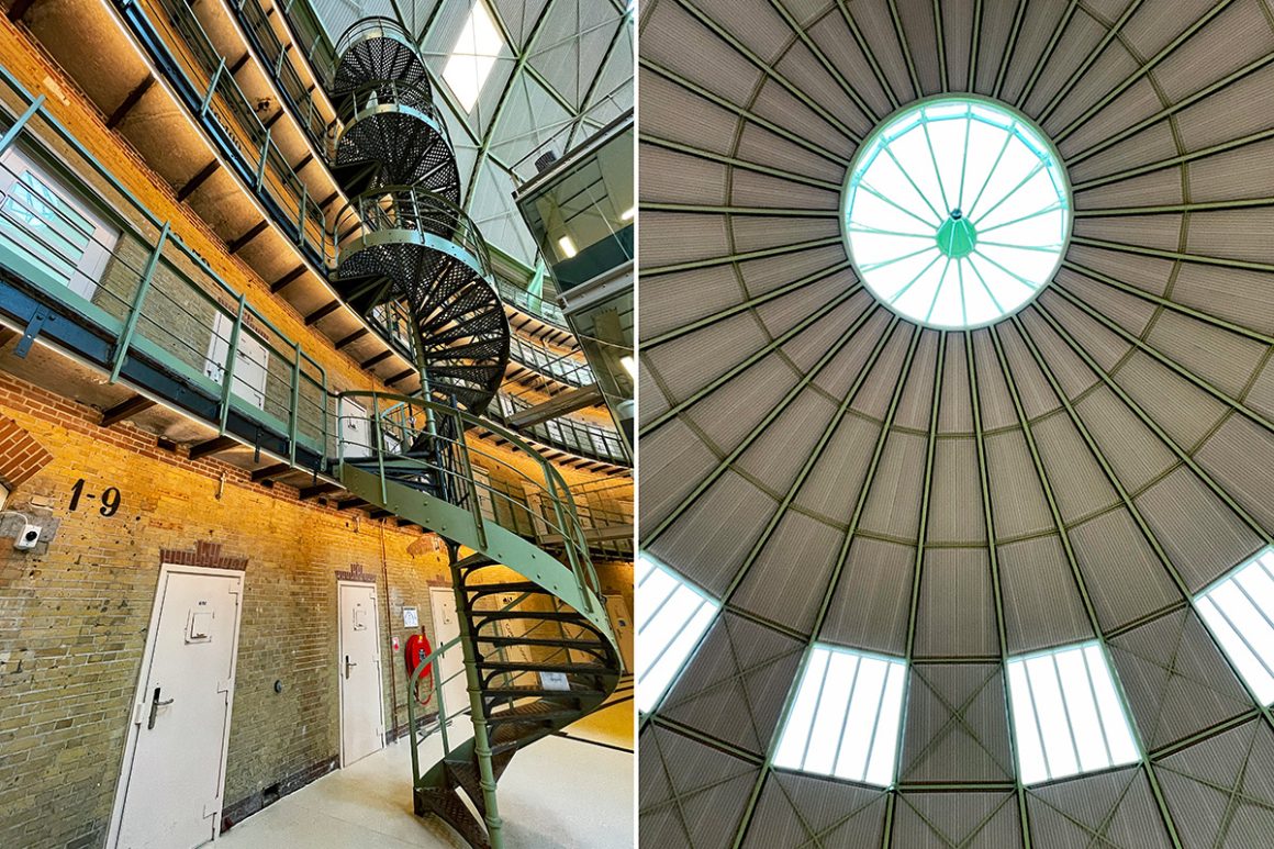 Achter de molen staat de voormalige Koepelgevangenis. Nu een mooi open ingericht, vrij toegankelijk, verzamelgebouw met een universiteit, bioscoop, café, restaurant, hotel en werkplekken. De cellen rondom zijn er nog, de wenteltrappen ook. En natuurlijk hoog boven je de enorme koepel. Mooi om te zien.