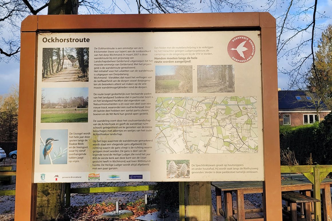 De Ockhorstroute is bewegwijzerd met bruine bordjes met een witte vliegende gans. Je volgt de richting waarop de gans vliegt. De route is gemaakt door het Dorpsbelang Wichmond-Vierakker. Je loopt over twee landgoederen (Hackfort en ’t Suideras), door bossen, langs beekjes en over weilanden waar boeren toegang hebben verleend.