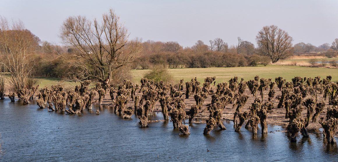 Na het rondje om kasteel Neerijnen steek je de Van Pallandtweg over en kom je via een stijgend bospad uit bij water. Nee, dit is nog niet de Waal, maar de Kil, een oude rivierloop. Met het water aan je rechterhand loop je hoog over de dijk. Mooie witte boerderijtjes, een ooievaarsnest en overal knotwilgen in en langs het water. ’s Winters zijn het donkere, onheilspellende knotsen, maar in de zomer zien ze er heel wat lieflijker uit, met hun lange, wuivende takken vol zachtgroene bladeren.