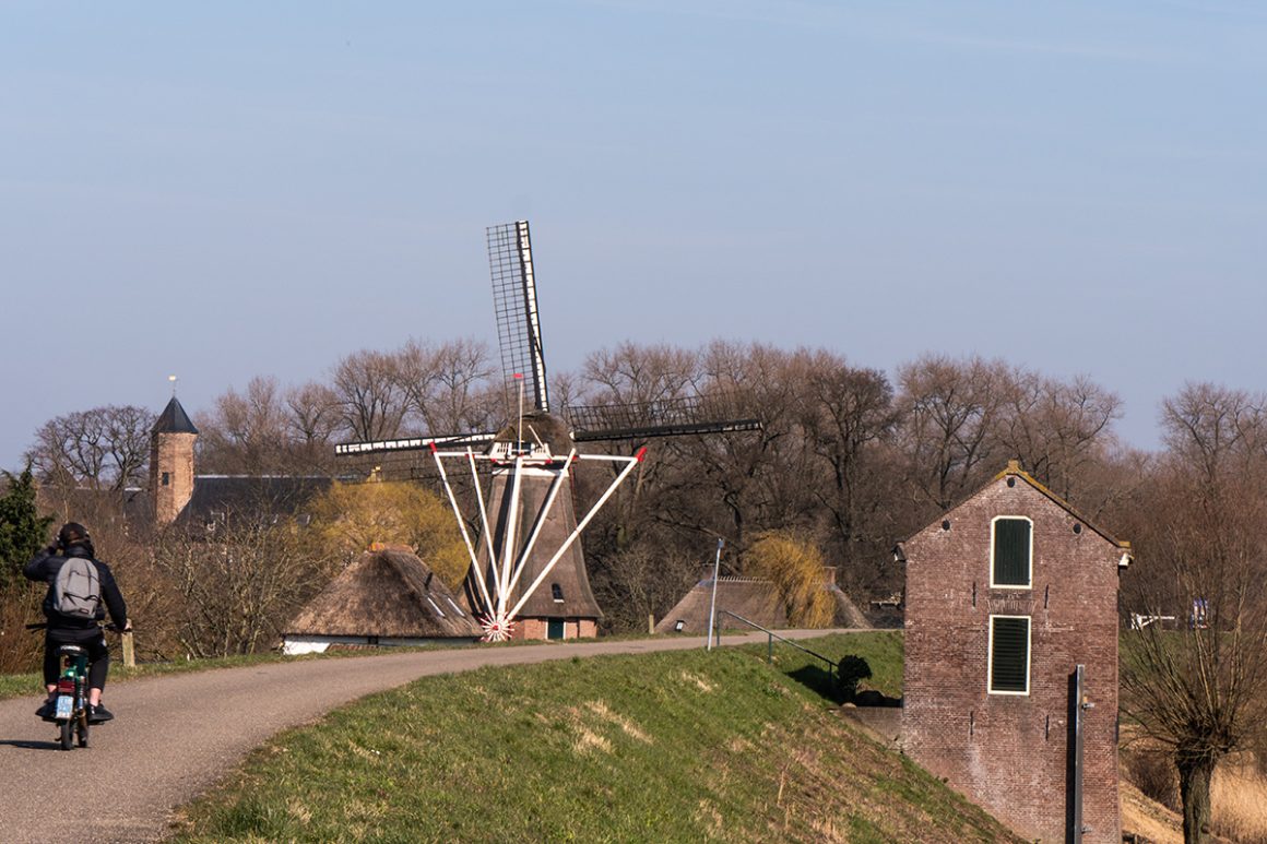 Links ligt Geldermalsen, maar voor deze wandeling sla je rechtsaf. Daar zie je meteen al een oud dijkmagazijn, buitendijks aan het water gelegen. Vroeger werden daar noodmaterialen voor de dijkbewaking opgeslagen. Nu is Museum de Oersprong er gevestigd, een natuurhistorisch museumpje met o.a. een collectie fossielen en mineralen. Schuin aan de overkant staat de rietgedekte korenmolen en door de bomen zie je de torens al van kasteel Waardenburg.