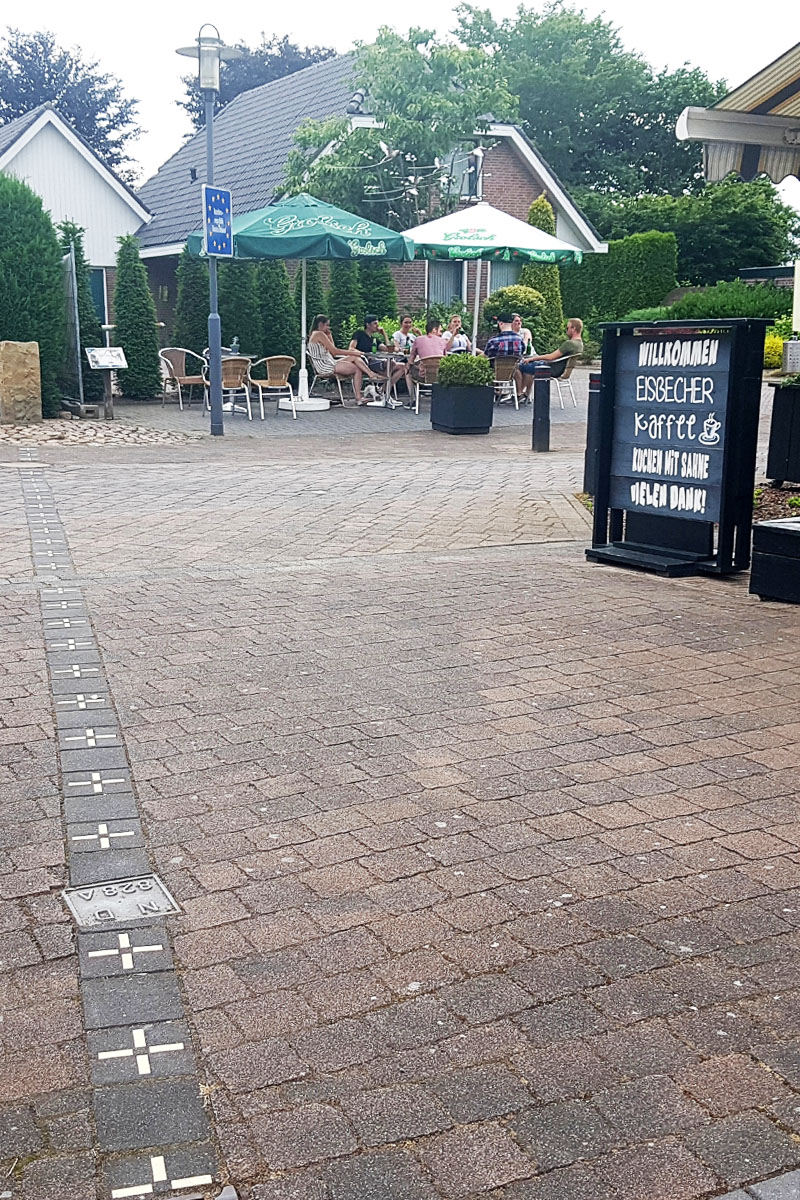 Tot 1990 werden beide zijden verdeeld door een grenskantoor met een slagboom halverwege de straat. Het oude grenskantoor, met een grenssteen en slagboom, is nog aanwezig. In de straatstenen is de grensmarkering verwerkt.