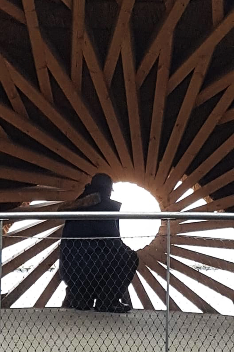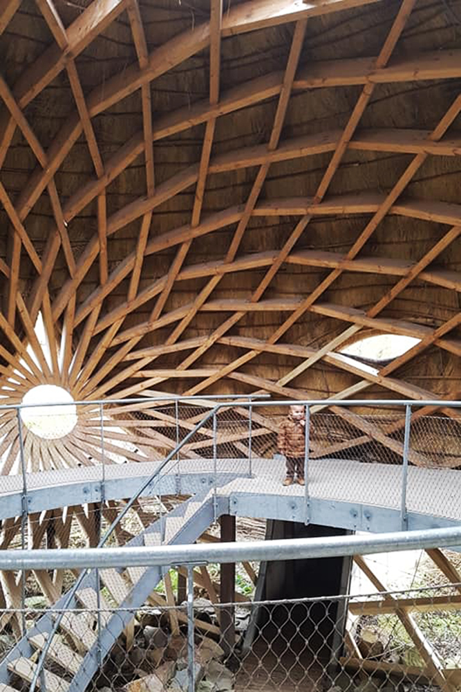 Vanaf de gratis parkeerplaats loop je via een pad met doorkijkjes en vlonders naar het observatorium. Het is verstandig om deze route te wandelen wanneer het water niet te hoog staat, anders heb je kans op natte voeten. Aan het eind van het pad ligt het gigantische ei. Zodra je binnenkomt krijg je een ‘wauw’ gevoel. De lichtinval, de prachtige houten balken en het gebruik van de materialen is zo ontzettend goed. Nog nooit heb ik zo’n mooi observatorium gezien.