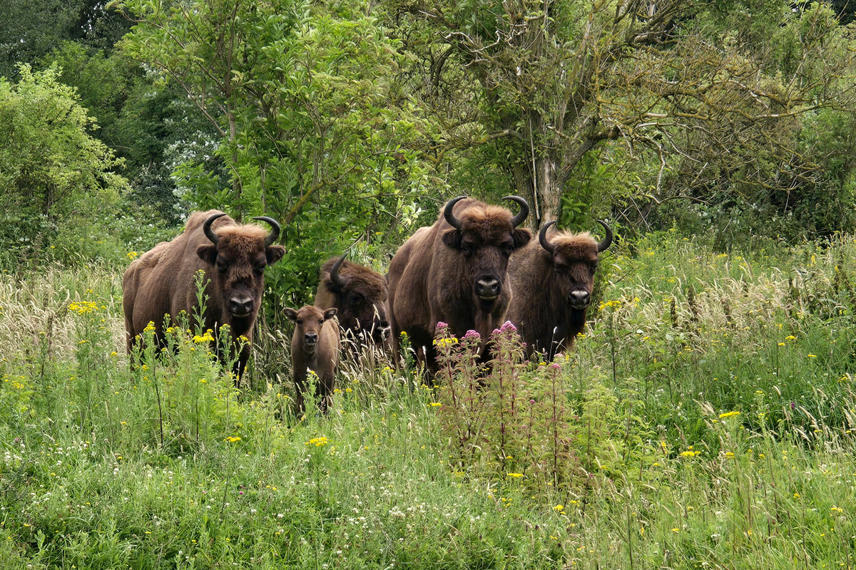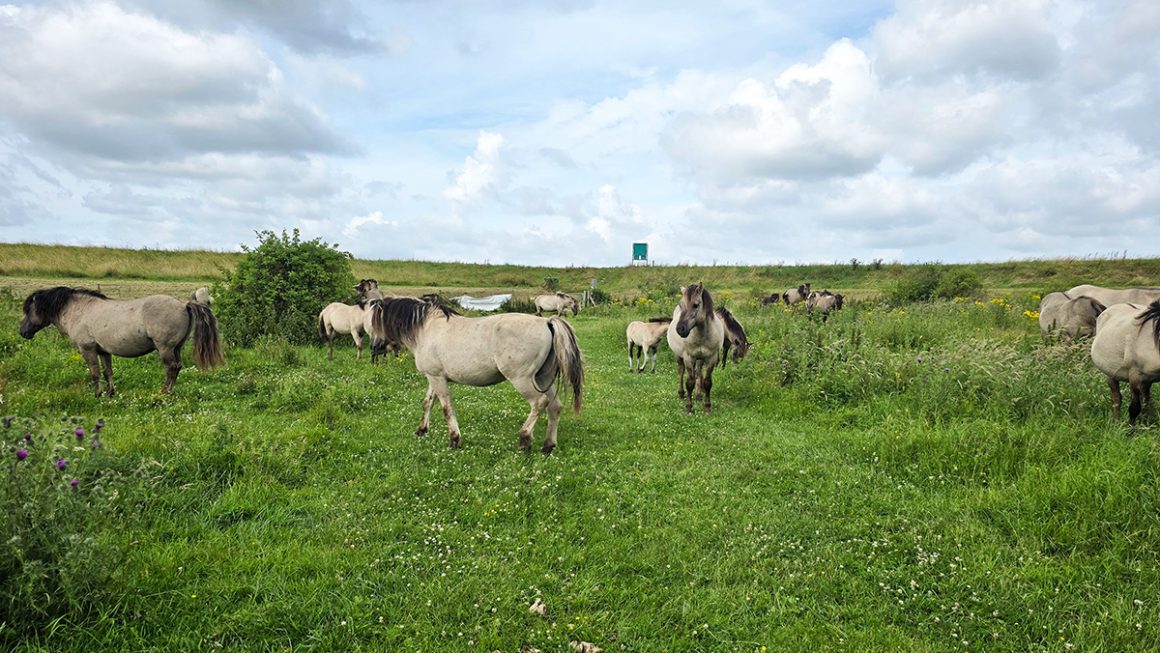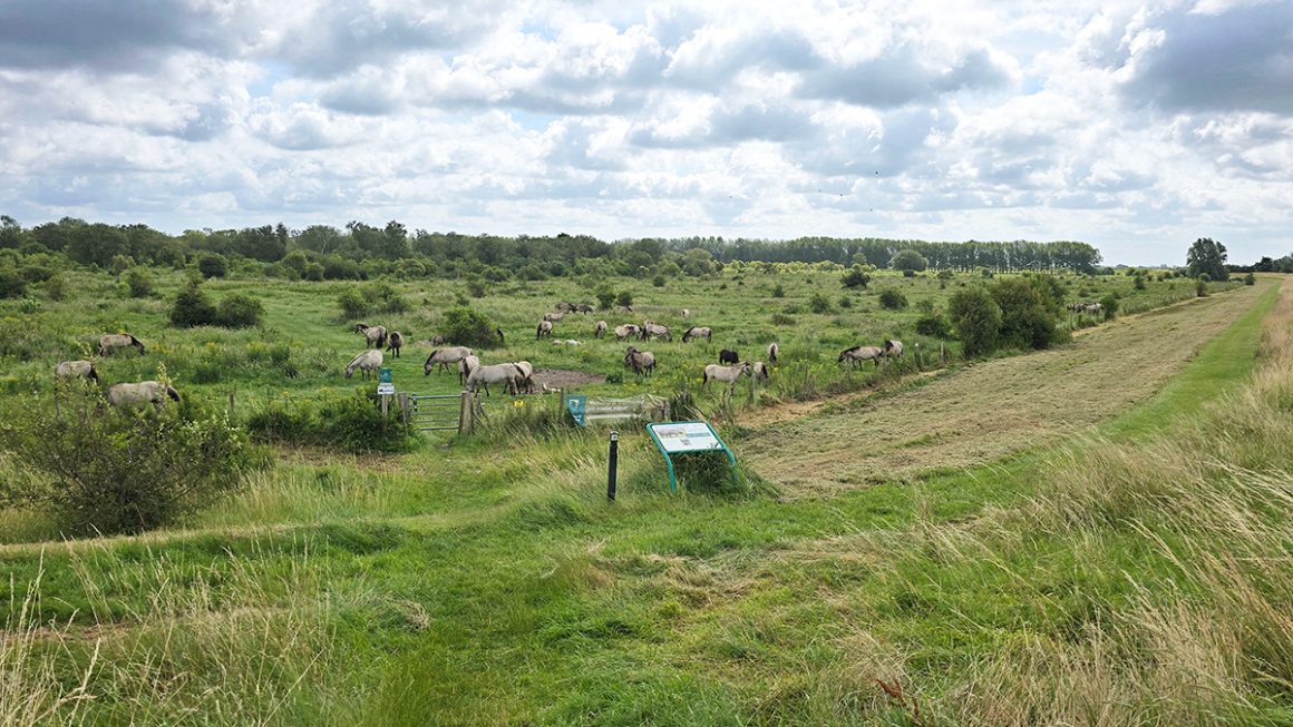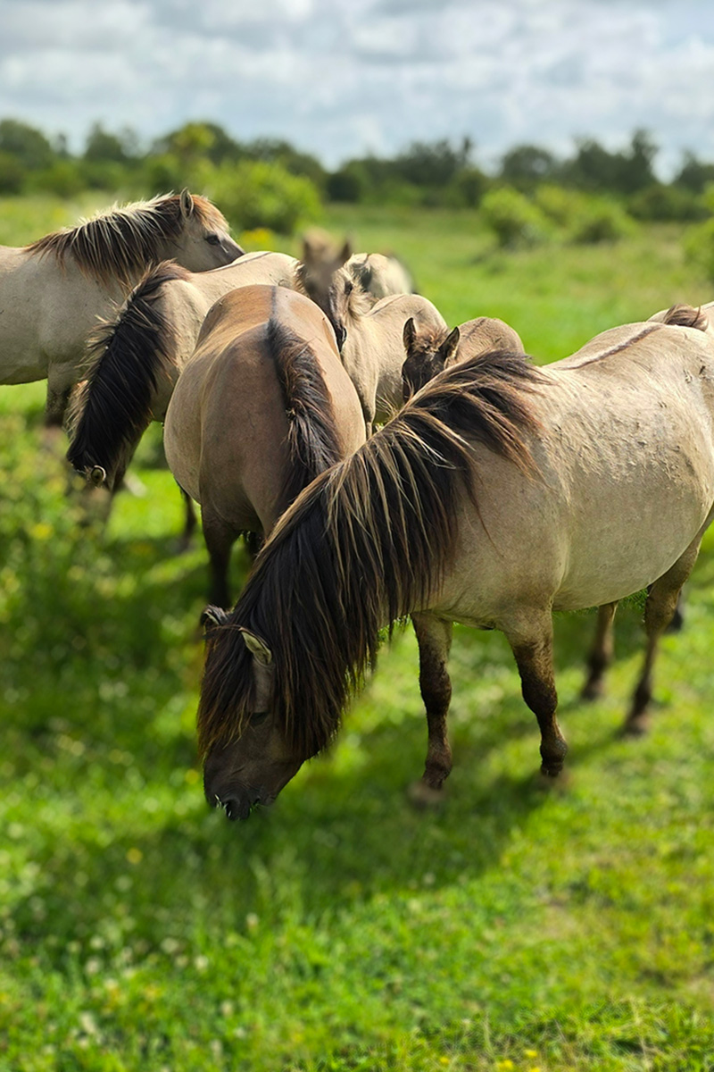 In het gebied leven drie soorten grazers: rode geusrunderen, konikpaarden en wisenten. Zij hebben alle drie een eigen manier van eten en vullen elkaar daardoor perfect aan. Samen houden zij de ontwikkeling van duinriet, viltbraam en exoten zoals de reuzenberenklauw onder controle. Ook hun leefgedrag heeft een positieve bijdrage op de biodiversiteit in dit gebied. Tijdens onze wandeling hebben we twee van de drie grazers kunnen spotten.