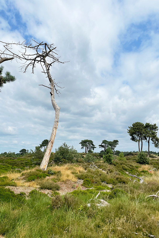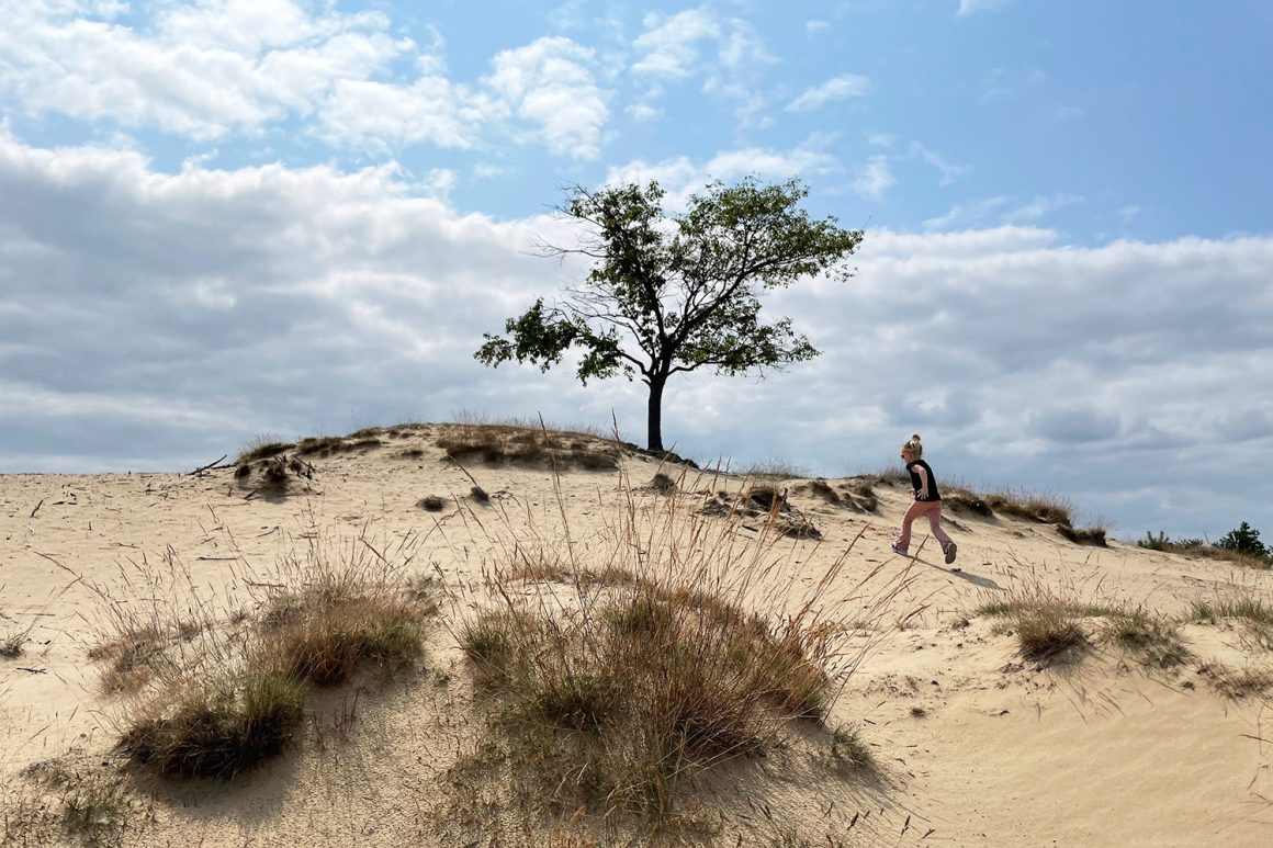Wij liepen de wandelroute van 5,5 km, te vinden op de website van Staatsbosbeheer. Via een klaphekje loop je het gebied in. Het eerste deel van de wandeling gaat over brede zandpaden door een wat vlakker deel tussen gras en heide. Met een beetje geluk zie je de heideschapen die voor de begrazing van het gebied zorgen. Na een tijdje wandelen, sla je rechtsaf en wandel je midden tussen de stuifduinen.